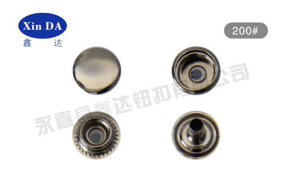 四合扣是紐扣的一種,俗稱彈簧扣、車縫鈕。四合扣靠S型彈簧結(jié)合,從上到下分為ABCD四個(gè)部件:AB件稱為母扣,寬邊上可刻花紋。中間有個(gè)孔,邊上有兩根平行的彈簧;CD件稱為公扣。中間突出一個(gè)圓點(diǎn),圓點(diǎn)按入母扣的孔中后被彈簧夾緊,產(chǎn)生開合力,固定衣物。