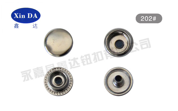 四合扣是紐扣的一種,俗稱彈簧扣、車縫鈕。四合扣靠S型彈簧結(jié)合,從上到下分為ABCD四個部件:AB件稱為母扣,寬邊上可刻花紋。中間有個孔,邊上有兩根平行的彈簧;CD件稱為公扣。中間突出一個圓點,圓點按入母扣的孔中后被彈簧夾緊,產(chǎn)生開合力,固定衣物。